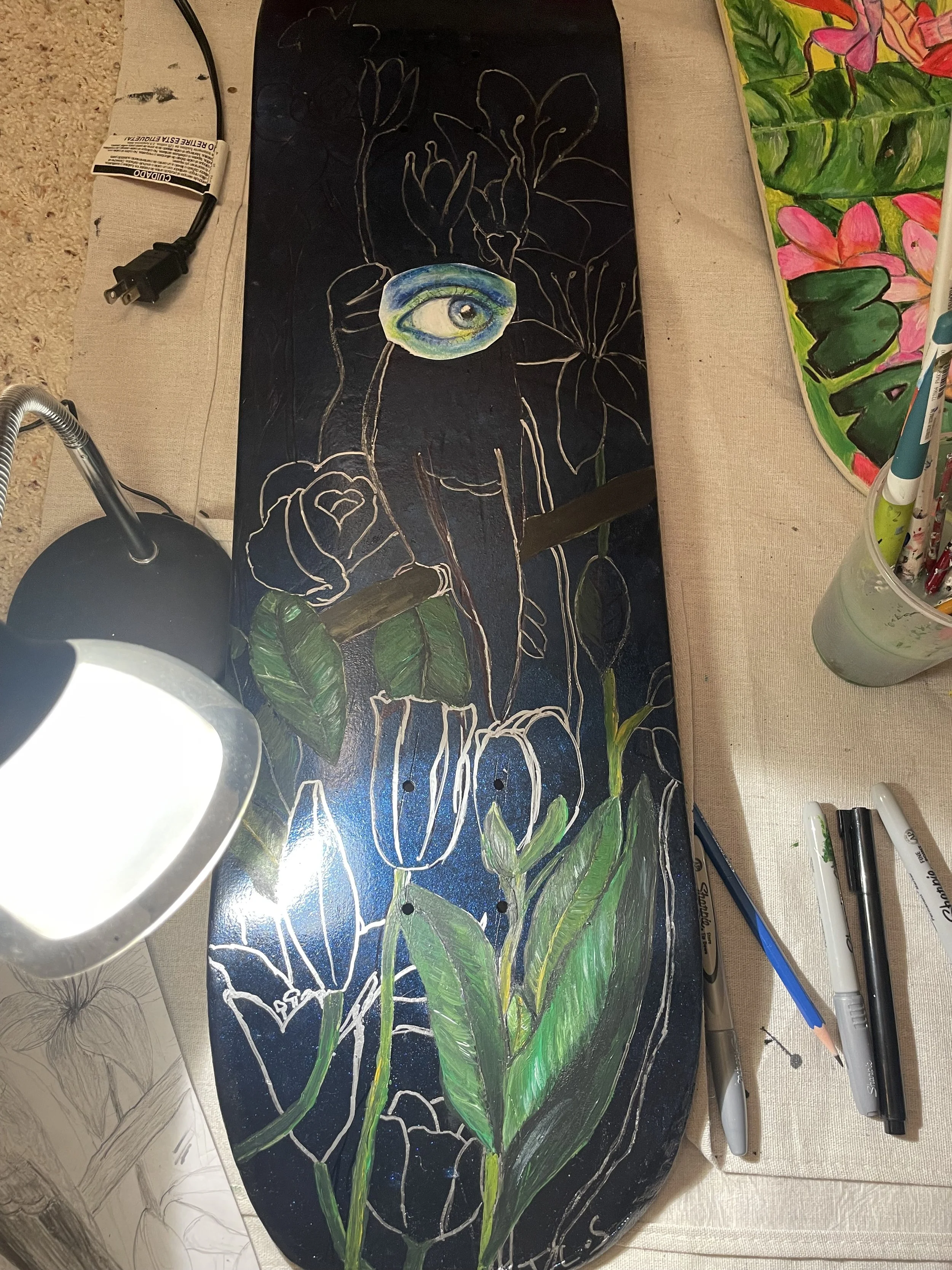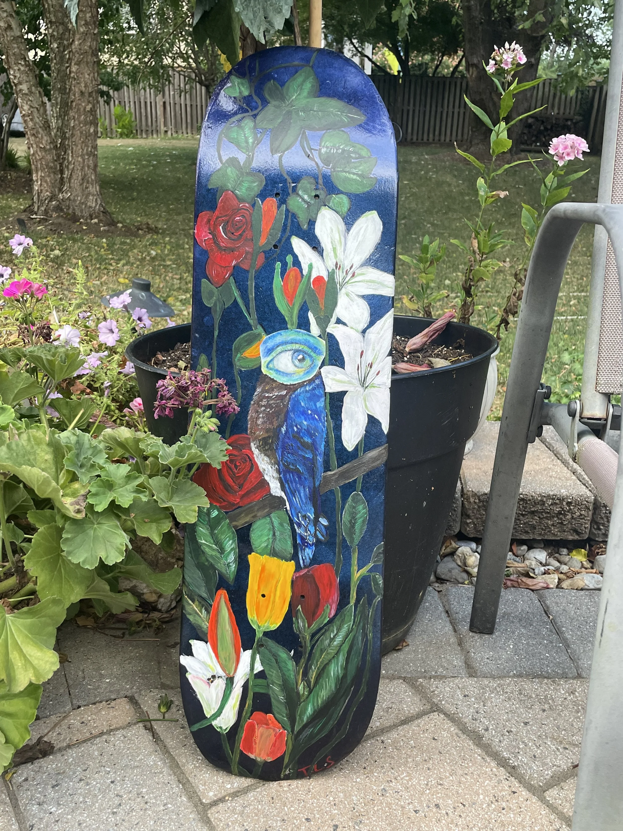 bird’s-eye view, acrylic on skateboard deck, 2024
