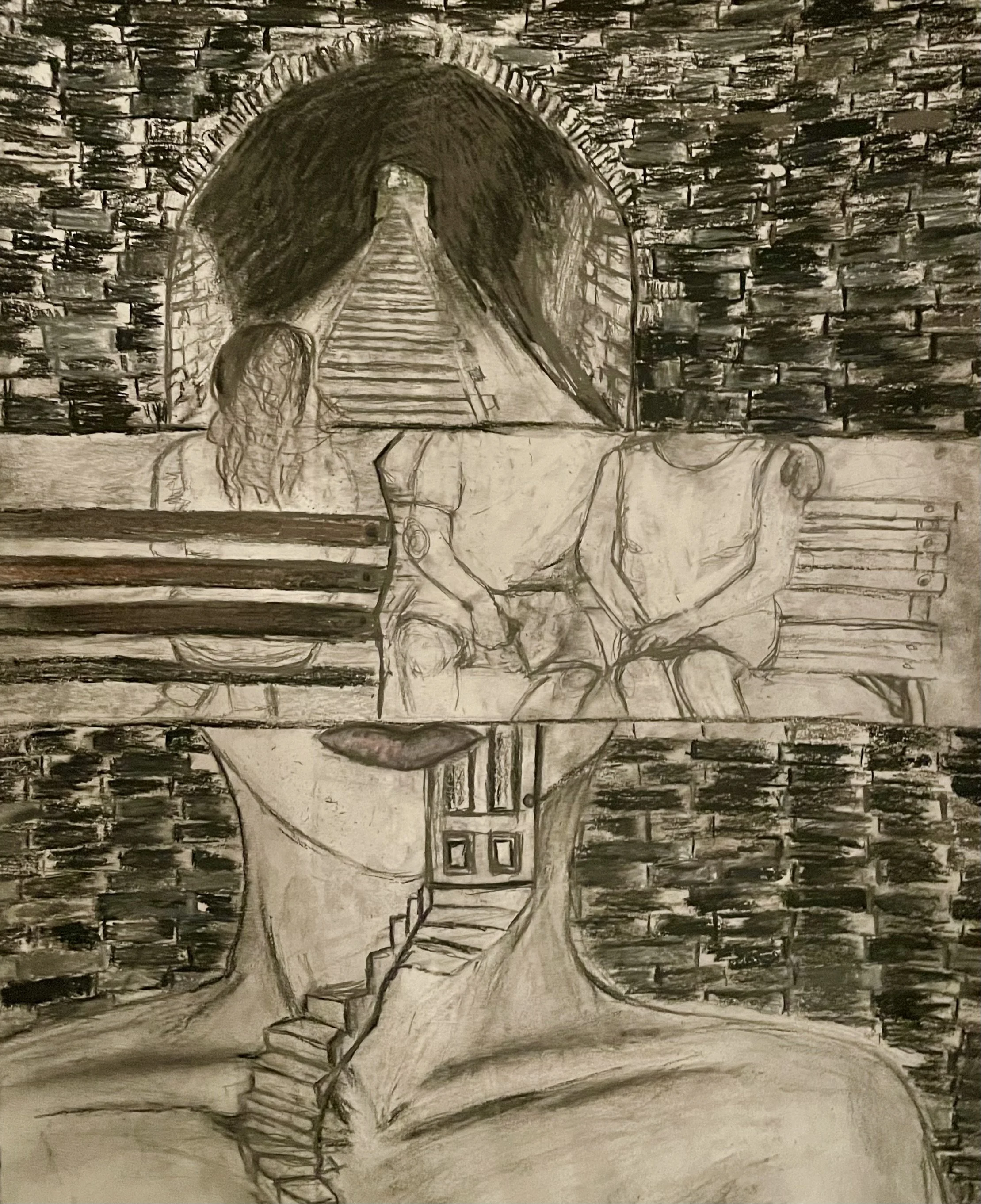 at the end of the tunnel, 11” x 14”, charcoal and oil pastel on paper, 2025